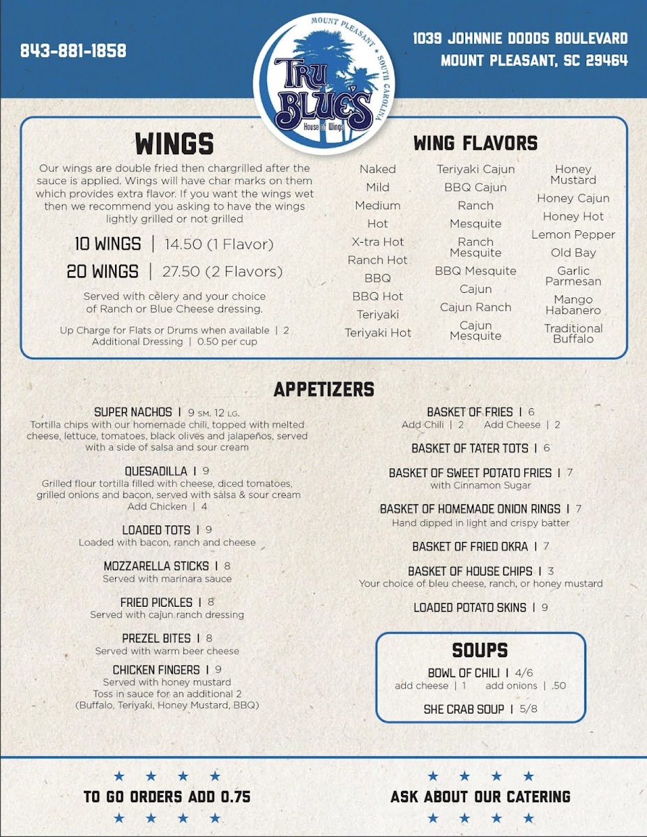 Welcome to Tru Blues House of Wings, a must-visit destination for wing enthusiasts located at 1039 Johnnie Dodds Blvd, Mt Pleasant, SC. This lively bar and grill combines a vibrant atmosphere with a menu that showcases mouthwatering wings, praised for their rich flavors and perfect cooking. Customers rave about favorites like the Terri-Hot sauce and the signature frying and grilling technique that elevates each bite.